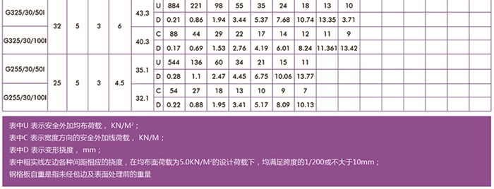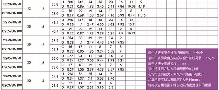 平面型扁鋼中心距為30常用格柵板規格型號及安全荷載表
