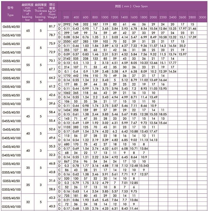 平面型扁鋼中心距為40常用鋼格柵板規格型號及安全荷載表